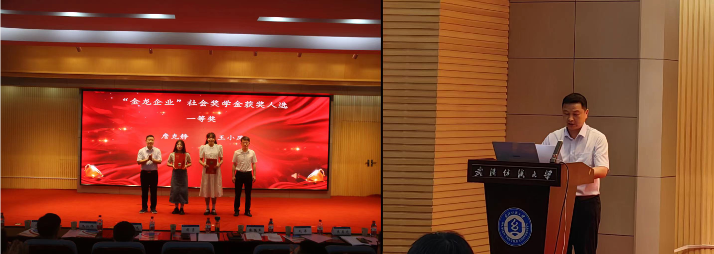 湖北金龙集团是一家集高分子纺织涂覆材料研发、生产、销售、售后服务于一体的智能制造企业,是一家多元化发展、集团化经营的高新技术企业,省专精特新小巨人企业和全国细分领域隐形冠军,同时也是一家致力于以产业发展助力教育发展的优质企业。今年湖北金龙集团为威廉希尔体育捐赠资金,设立“金龙”企业奖学金,为激励学生立足纺织专业成长成才提供动力。在现场,主持人介绍金龙奖学金评选情况后,湖北省金龙集团邹勇总经理宣读金龙企业奖学金获奖名单,寄语青年要树立远大理想,坚忍不拔、奋发向上,以踏实努力和深耕细作力争革新纺织技术、创新纺织成果,为纺织事业发展贡献自己的聪明才智,用纺织科技服务祖国与人民。同时邹勇总经理也邀请广大纺大学子去金龙实习实训、创业,加入金龙大家庭,成就更好的自己!