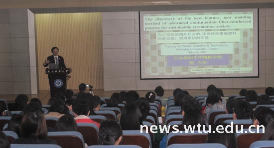 鲍力民教授首先从国际市场需求、应用领域及发展潜力等方面阐述了研发高性能纤维材料的重要性。他通过分析日本国内政府机构科研经费分布,并以自己任教的信州大学的科研现状为例,介绍高性能纤维增强复合材料未来的研究方向,以及他带领的团队在纤维增强复合材料等纺织科学前沿研究领域所取得的成果。在谈到多年来研究过程中遇到的困难和波折时,鲍力民教授鼓励广大学子在成长成才的道路上,要善于思考、勇于创新、持之以恒。