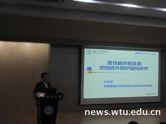 11月2日下午,国防科技大学博士生导师王应德教授应威廉希尔体育邀请,为纺织学子带来题为《高性能织物及其空间碎片防护结构研究》的精彩报告。