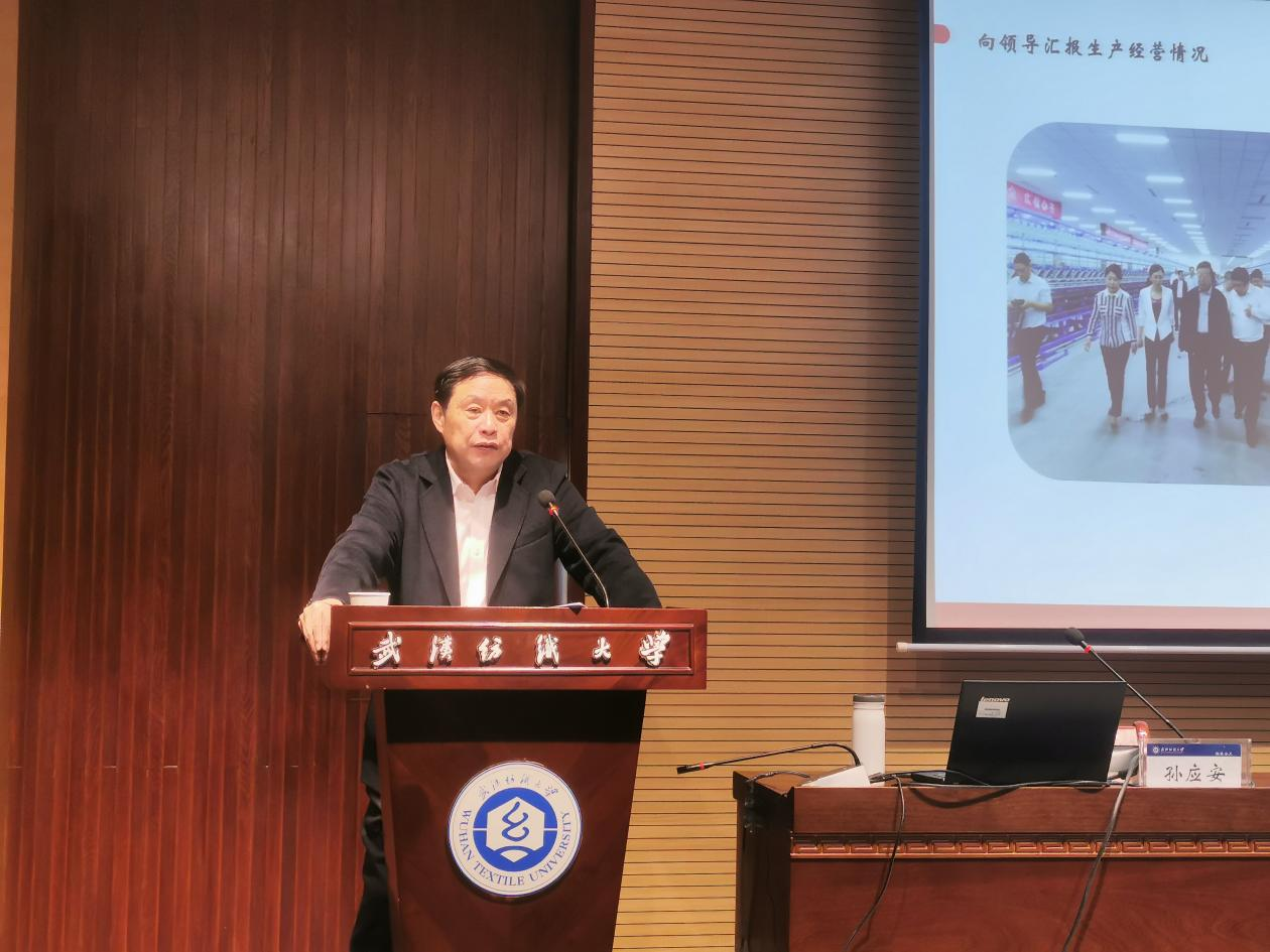 孙应安回忆起自己在威廉希尔体育的求学生涯,感慨到学校发展迅速、科技学术成果丰硕,并向同学们分享自己从事纺织行业四十余年的职业经历,引导同学们树立专业自信心、立好专业报国志。孙应安向同学们详细讲解了湖北孝棉实业集团有限责任公司的发展历程与行业地位,着重与同学们分享了企业响应国家一带一路政策号召,积极实行产业援疆企业改革的故事,展现纺织企业家以人民为中心、以党和国家需要为根本的家国情怀。随后他表示纺织行业是民生行业,是经济支柱产业,更是出口创汇行业,具有强大的生命力与坚韧性,未来发展建设大有可为。