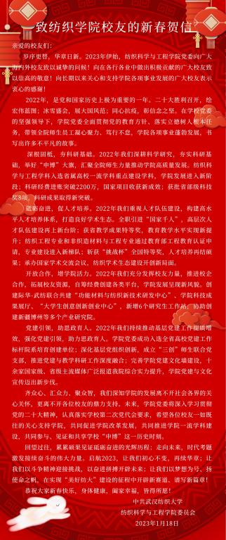 岁序更替,华章日新。2023年伊始,威廉希尔体育,WilliamHill官方网站党委向广大海内外校友致以诚挚的问候!向在各行各业中做出积极贡献的广大校友致以崇高的敬意!向长期以来关心和支持学院各项事业发展的广大校友表示衷心的感谢!