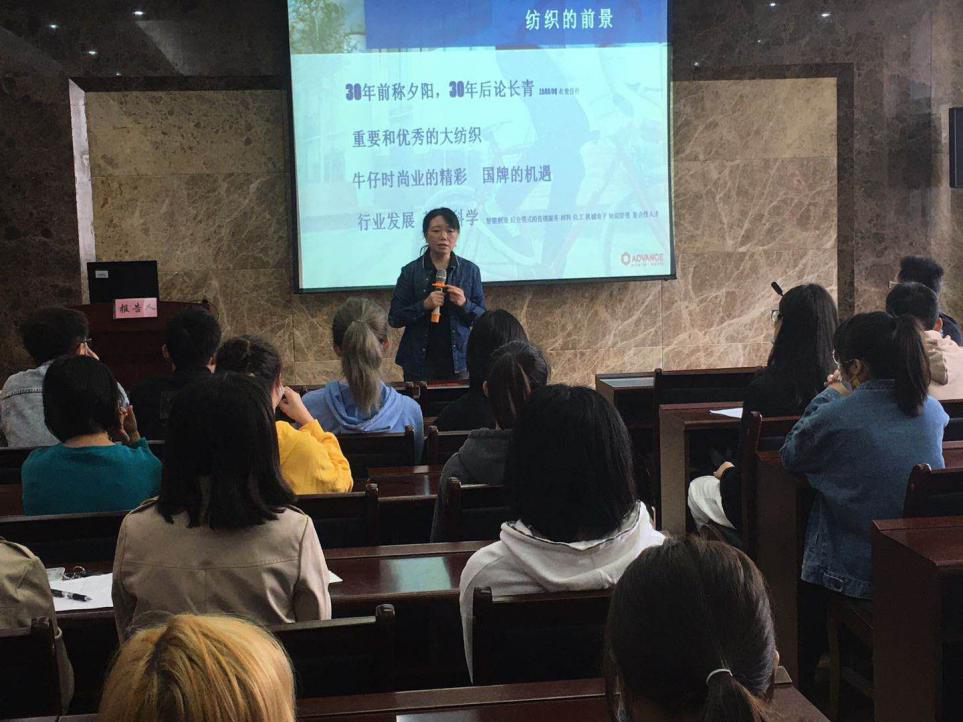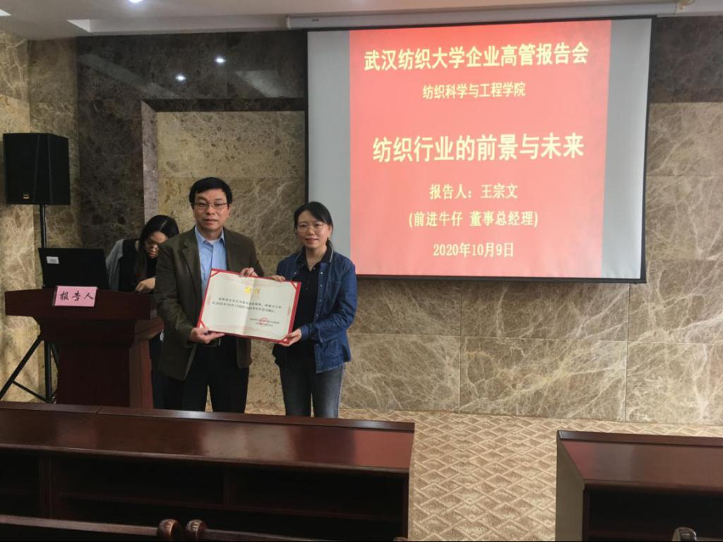王总经理向同学们详细介绍了牛仔时尚行业的发展现状,并结合自身经验,深入分析了牛仔时尚行业的未来发展和创新方向,为同学们开拓了视野,增长了见识。同时,王总经理从核心价值、研发创新、客户资源三个方面介绍了公司风采,展示了企业实力,并分享了个人成长经历及成就,在最近2020年的全球Rivet 50牛仔行业前50名影响力人物评选中当选,此评选的50名含设计师、品牌主、商业领袖和服装、面料及原材料制造企业的专家,王总经理是迄今入选唯一的中国人。报告结束后,张院长向王总经理颁发了客座教授的聘书。
