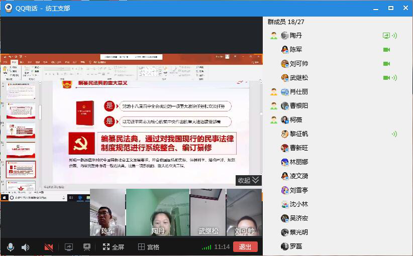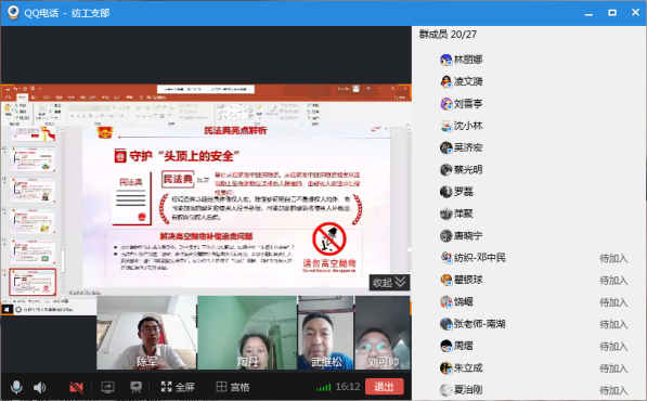 2020年6月30日晚6时,威廉希尔体育纺织工程系教工党支部通过QQ视频开展“学习民法典”线上主题党日活动,会议由支部书记陶丹主持,全体教工党员参加。
