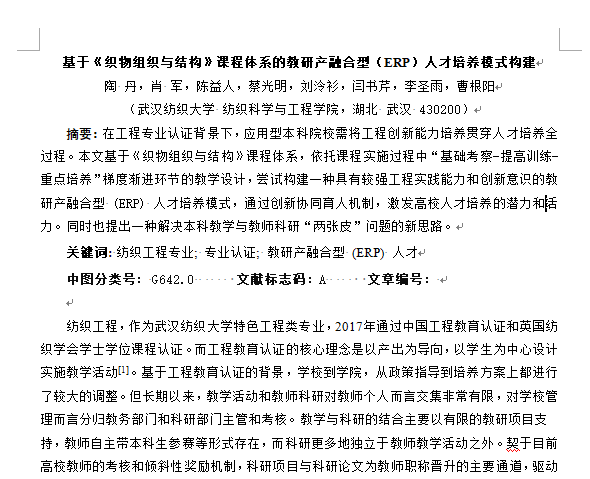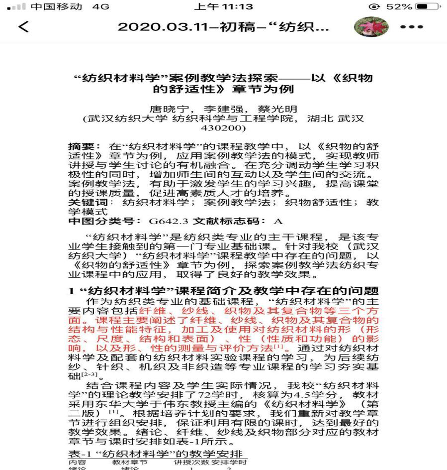面对疫情,学院部分青年教师宅在家里,缺少工作氛围。“湖北名师工作室”主持人李建强教授鼓励大家利用在家的时间写一篇教研论文,并非常耐心地讲解教研论文对学科发展以及教学工作的重要意义。在李老师的指导下,青年教师饶崛老师撰写教研论文并被《纺织服装教育》收录,新进博士唐晓宁老师的教研论文也已完稿待投。回忆论文的写作过程,唐老师讲到:“起初,觉得自己教学经验很少,不敢动笔去写,李老师鼓励我思考总结《纺织材料学》课程的助教情况以及他在教学模式上的创新尝试,并让我向蔡光明副院长请教教研论文的写作手法。论文撰写的过程中,李老师针对学生培养、专业认证、思政教育以及学科内涵等内容提出宝贵意见,作为主管教学的副院长与纺材课程的任课教师,蔡老师则是从教学日常管理以及培养目标达成等角度,对论文提出修改建议”。通过教研论文的撰写,青年教师对专业知识体系及教学设计均有了更深刻的认识。