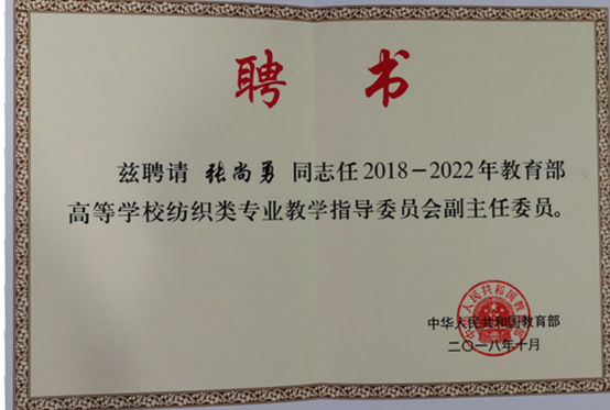 12月23日,2018-2022年教育部高等学校纺织类专业教学指导委员会成立大会在东华大学召开。会上,教学指导委员会主任、全国教学名师东华大学郁崇文教授为教指委成员颁发证书,我校推荐的张尚勇教授经教育部遴选后聘请为副主任委员。中国纺织服装教育学会会长倪阳生、东华大学副校长舒慧生及17所举办纺织本科教育的高校教指委成员参加了会议。