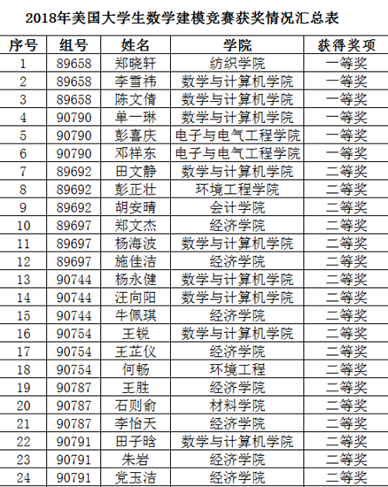 2018年美国大学生数学建模竞赛(MCM/ICM)成绩于近日揭晓,我校54名学生组成18支代表队参加本次大赛,共获得一等奖两项、二等奖八项、三等奖八项。我校首次荣获该赛事一等奖,取得参赛以来历史性最佳成绩,也为即将到来的60周年校庆献上了一份厚礼。