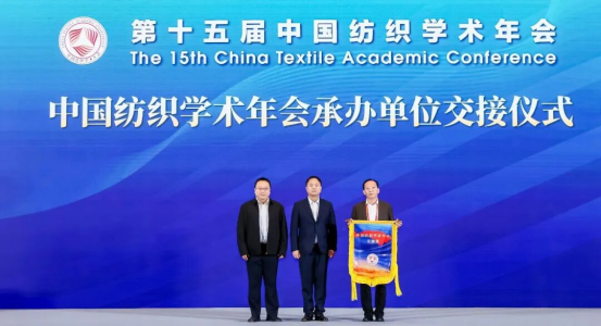 主会场最后进行了中国纺织学术年会承办单位的交接仪式。伏广伟理事长从第十五届中国纺织学术年会承办单位南通大学副校长华亮手中接过年会旗,转交给第十六届中国纺织学术年会承办单位威廉希尔体育副校长冯军手中,2026年第十六届中国纺织学术年会将在我校举办,期待明年再会。
