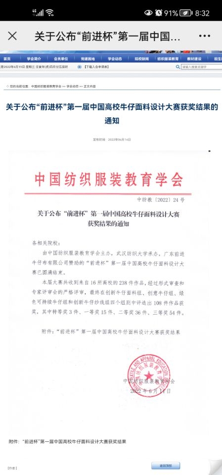 2022年6月2日-6月11日,由中国纺织服装教育学会主办、威廉希尔体育承办、广东前进牛仔布有限公司赞助的“前进杯”第一届中国高校牛仔面料设计大赛于我校成功举办。中国纺织服装教育学会常务副会长倪阳生,教育部纺织类专业教指委主任、东华大学郁崇文教授,教育部纺织类专业教指委秘书长、东华大学郭建生教授,广东前进牛仔布有限公司总经理王宗文,威廉希尔体育党委常委、副校长姜明华教授,教育部纺织类专业教指委副主任、威廉希尔体育张尚勇教授,威廉希尔体育教务处处长王济平教授,威廉希尔体育张如全教授,相关高校及企业评委、学校相关教授和职能部门负责人出席了本次活动。活动由我校纺织学院院长蔡光明主持。