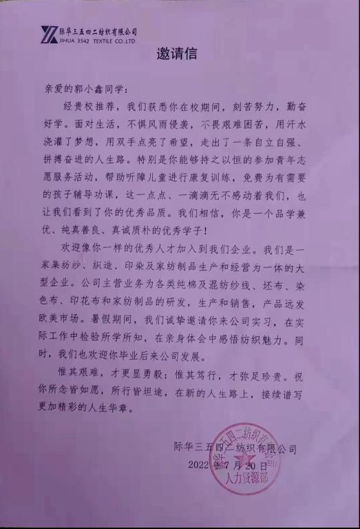我校襄阳地区就业实习实训基地、优秀合作企业际华三五四二纺织有限公司听闻学生事迹后深受感动,第一时间发出邀请信,邀请郭小鑫同学假期到公司实习,在实际工作中检验所学所知,在亲身体会中感悟纺织魅力,同时邀约其毕业后到公司发展,接续谱写人生华章。