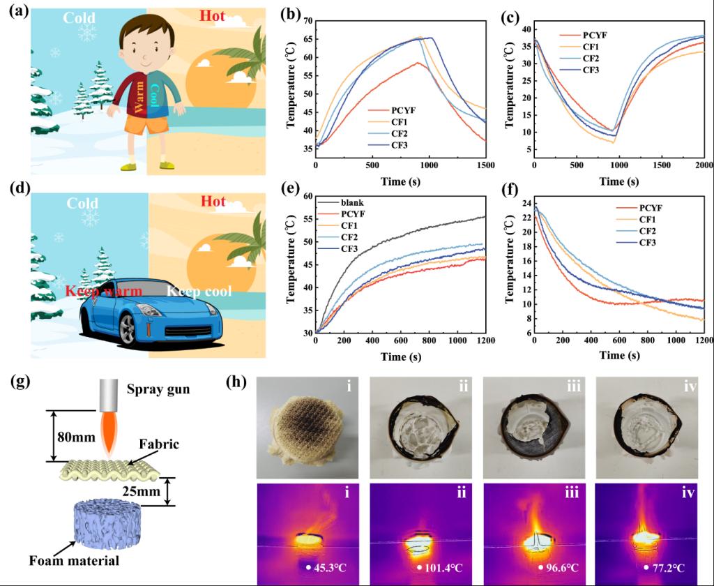 此外,该织物在冷热场景测试时,表现出优异的调温性能,在热环境中与其它商业相变织物相比低9 ℃,同时该织物可以承受1142 ℃的火焰温度。(图4)