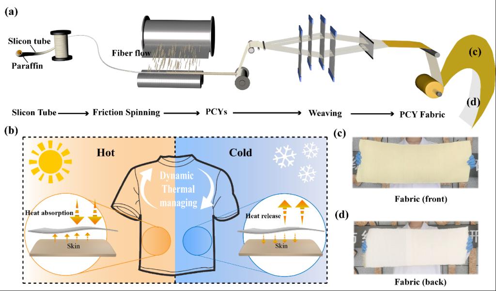 热管理和超高防护纺织品对极地科学家、宇航员和消防员至关重要。然而,大规模制造耐用热管理、超高热防护的包芯纱线仍是一个挑战。近期,威廉希尔体育徐卫林院士团队的夏治刚教授课题组,携手华中科技大学苏彬教授,创新提出液流纺制备一种基于石蜡的包芯纱(图1),实现了热管理纱线的批量化生产,用于极端温度和热防护。
