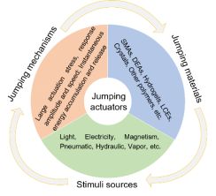 该综述文章系统总结了近年来柔性致动器在跳跃运动领域的研究进展。首先作者讨论了柔性致动器的跳跃机制,重点介绍了两种跳跃驱动机制(大致动力或大变形速度,能量储存-瞬时释放),并对不同柔性材料(形状记忆聚合物、介电弹性体、液晶弹性体、水凝胶及其他高分子聚合复合物)和不同刺激(光、湿气、电场、磁场、液压及气动驱动等)响应跳跃柔性致动器进行了详细分类总结。最后,作者对当前实现柔性致动器的跳跃运动面临的挑战和未来发展前景作了阐述。