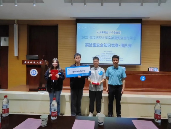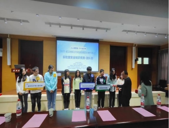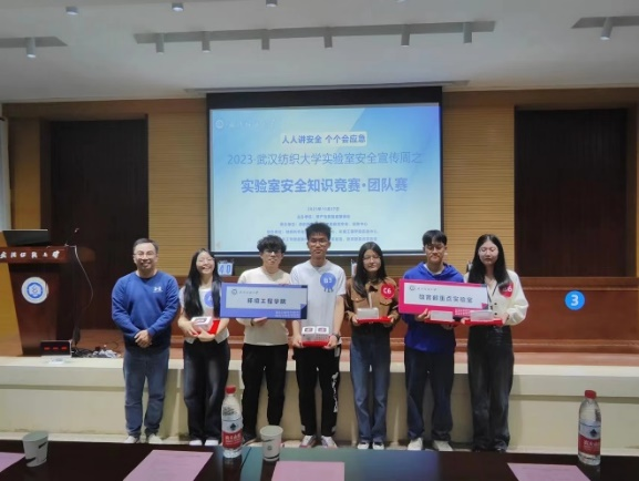 本次实验室安全知识竞赛分为两部分,网络个人赛和现场团队赛,个人赛中成绩优异的同学,经院系择优推荐3人组成团队参加现场赛。现场赛由威廉希尔体育,WilliamHill官方网站、材料科学与工程学院、环境工程学院、化学与化工学院、国家重点实验室、教育部重点实验室六支队伍组成。通过第一赛段—群雄逐鹿,第二赛段—三强鼎立,第三赛段—王者争霸,全方位实验室安全知识答题、竞赛抢答,决出胜负,其中化学与化工学院队伍获得一等奖,环境工程学院、教育部重点实验室获得二等奖,其他参赛队伍获得三等奖。比赛过程中,设立现场观众互动环节,同学们踊跃参与到活动中。比赛结束后,举行颁奖仪式,张艳波老师、孙磊老师和材料科学与工程学院实验中心主任陈祖玉老师分别为团队赛一等奖、二等奖、三等奖获奖同学颁发荣誉证书和奖品。