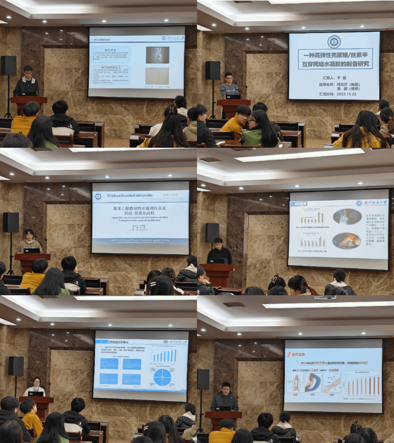 论坛上,赵华旺、张金芹、陈定伟、林雪晴、于猛、辛翔鹏六位同学依次介绍了自己的研究课题和目前取得的研究进展,并分享了自己的科研经验。主讲同学的研究课题涵盖了小口径人造血管、多色荧光微球、高弹性阻燃纱线、聚苯乙烯微球、壳聚糖/丝素半互穿网络水凝胶、机织/针织混编织物等领域,契合了“纺织新材料及绿色加工”主题,代表了学院最新研究进展,营造了良好的学术氛围。