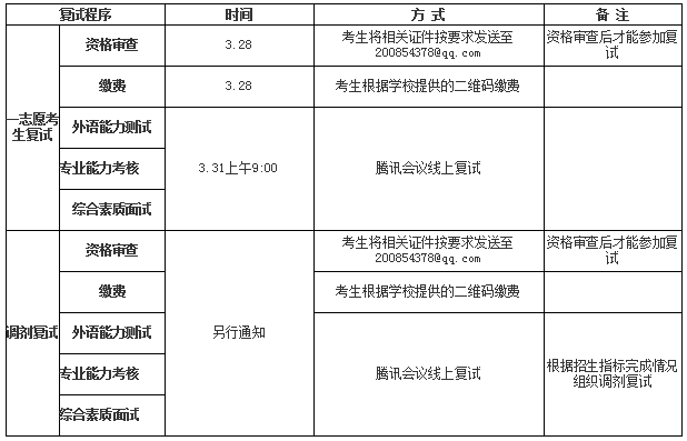 因本次采用远程复试方式,为保证复试顺利进行,学院将在复试前进行过程模拟和测试,具体测试时间及方式将在复试QQ群中通知。