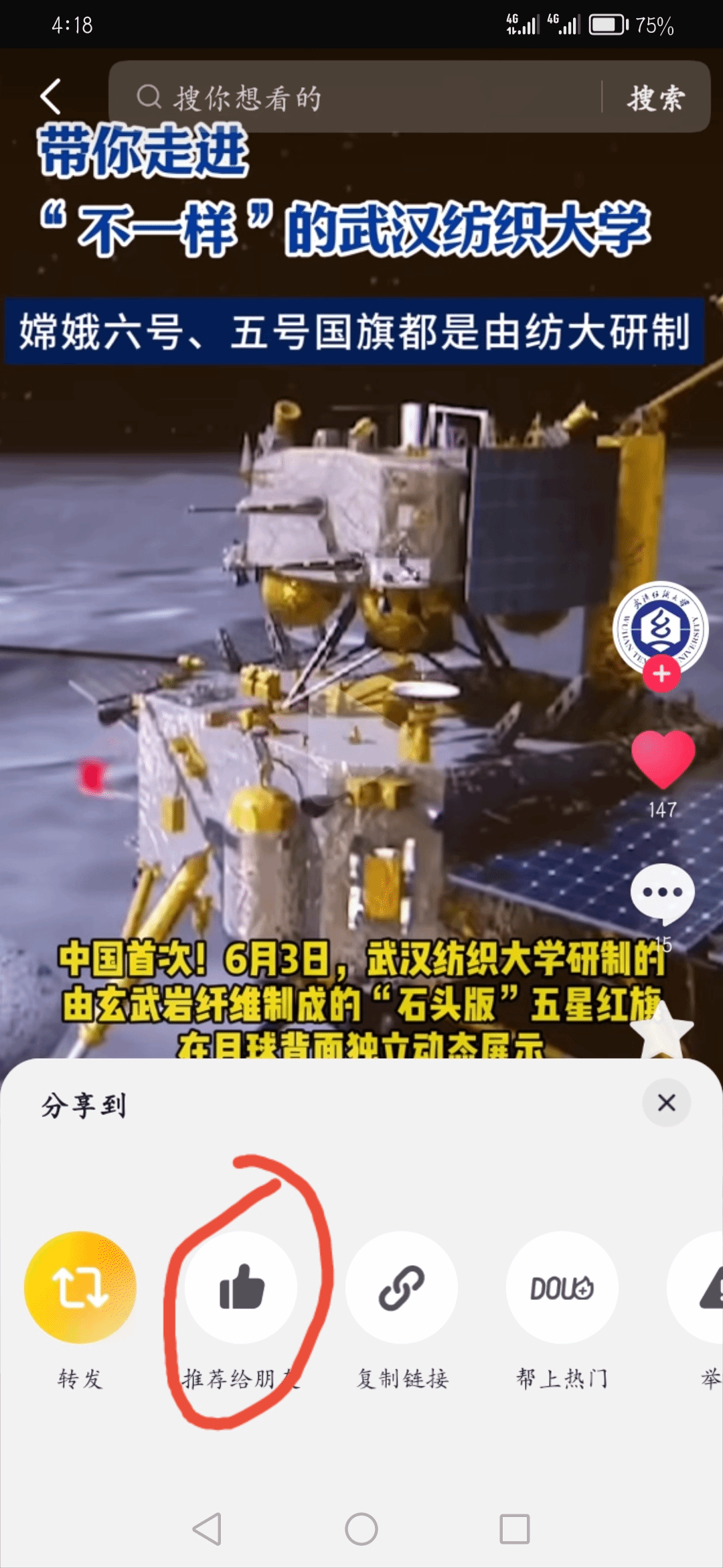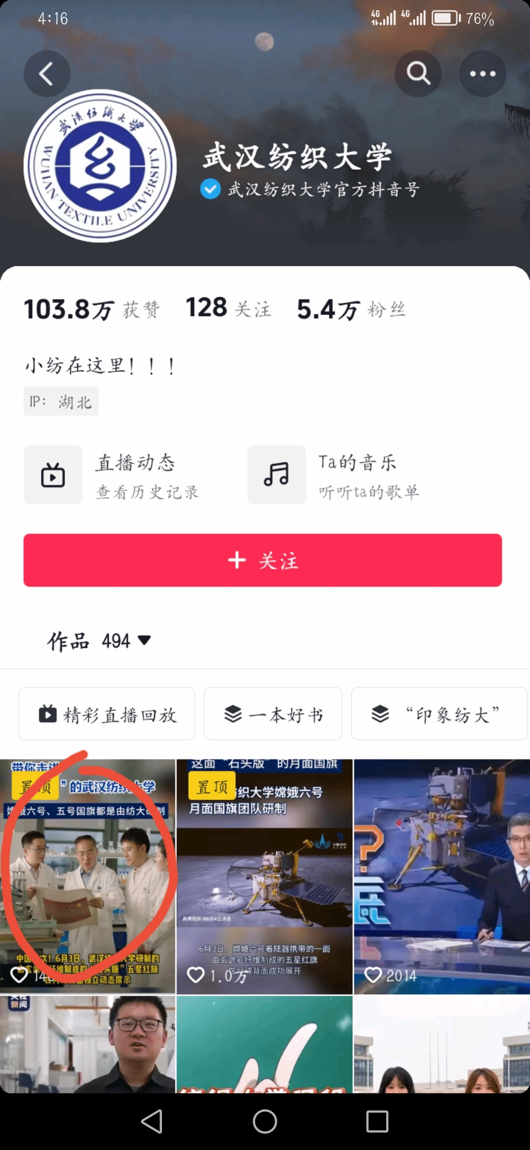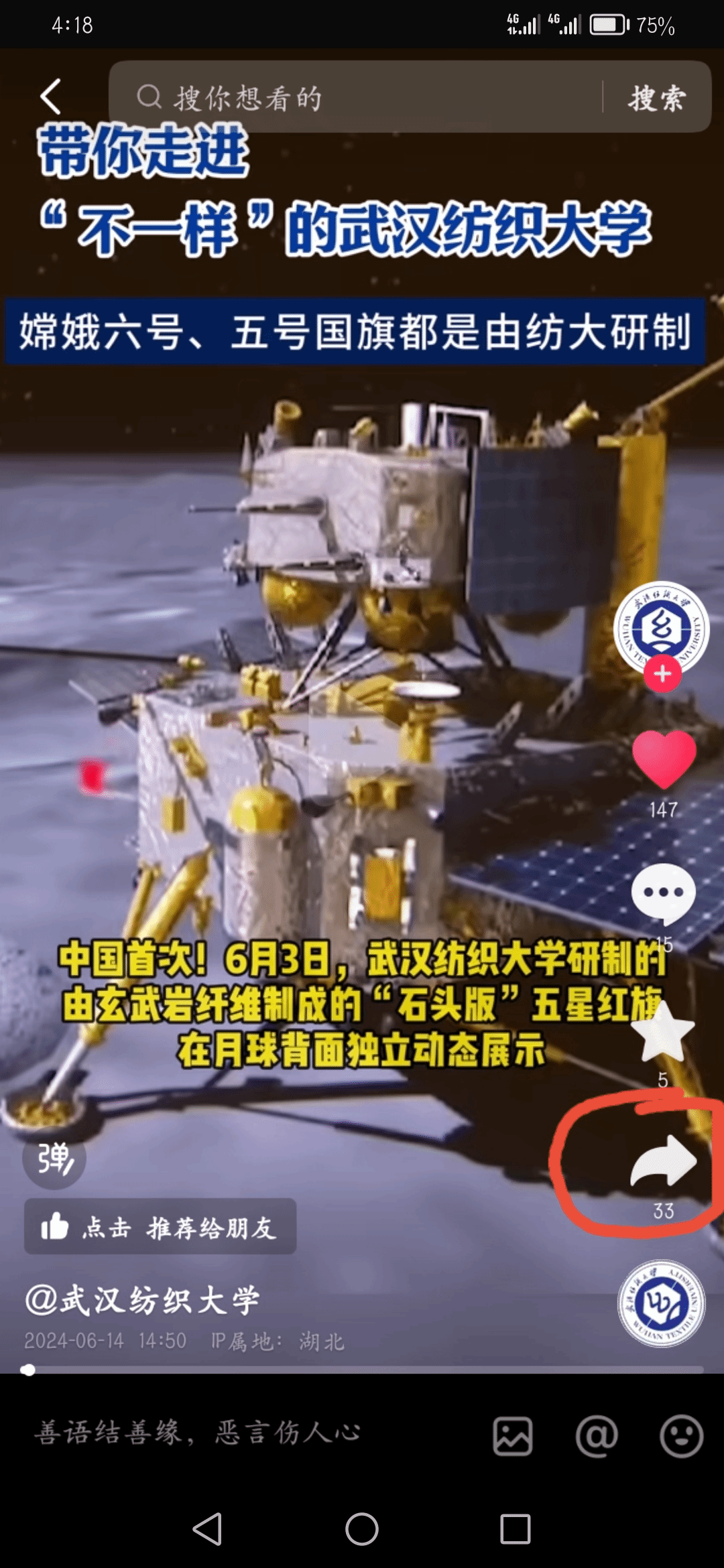 为配合做好2024招生宣传,宣传部围绕学校研制的嫦娥六号月面国旗,制作了《带你走进“不一样”的威廉希尔体育》招生短视频,并在学校官方视频号、抖音号、B站等平台进行了推送,为了进一步扩大宣传效果,请师生在抖音平台点赞、推荐。