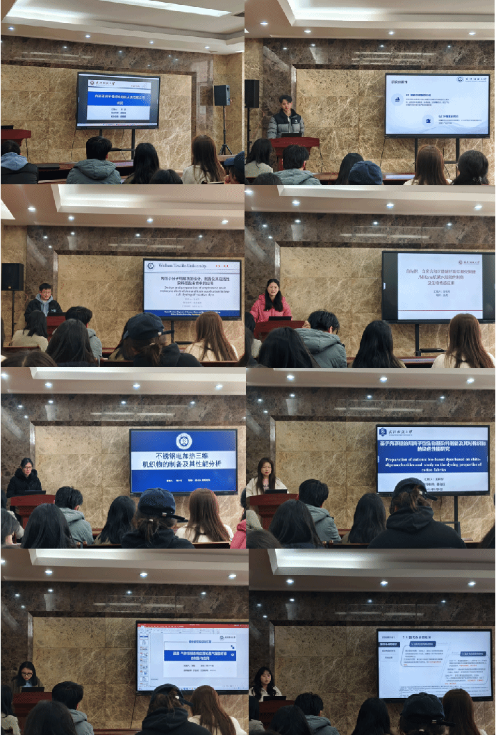 论坛上,董自豪、章凯、张必洋、邹毛毛、黄小可、王莉忻、周密、陈玥雪八位同学依次介绍了自己的研究课题和目前取得的研究进展,并分享了自己的科研经验。主讲同学研究课题包括,羧甲基纤维素和竹粉吸水树脂、内嵌碳纳米管纤维、两性小分子电解质、羧甲基壳聚糖/MXene抗菌水凝胶、不锈钢电加热三维机织物、阳离子型生物基染料、纳米芳纶基温度-气体双模态传感纤维、抗菌棉织物。这些研究课题契合了“纺织新材料及绿色加工”主题,代表了学院最新研究进展,参会人员积极提出问题和建议,营造了良好的学术氛围。