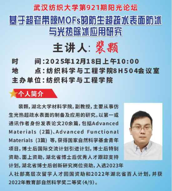 姜会钰首先介绍了裴颗副教授的科研、工作经历,并对裴颗副教授的出席表示了热烈欢迎。讲座中,裴颗副教授以“基于超窄带隙MOFs的防生超疏水表面防冰与光热除冰应用研究”为题,介绍了该课题的研究背景,并分享了他在防生超疏水表面防冰与光热除冰的研究进展,并对未来进行展望。交流中,裴颗副教授和参会的青年教师就构建具有多级微纳结构的仿生超疏水表面等问题进行了热烈的交流,为师生们答疑解惑,并为学院青年教师基金申报工作进行了指导和辅导,并祝学院在2026年基金申报工作中一帆风顺、满载而归。参会教生表示讲座内容干货满满、收获满满。最后,参会师生对裴颗副教授表示了诚挚感谢。