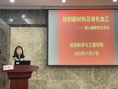 论坛上,陈佳慧博士介绍了举办研究生论坛的主旨和意义,同时宣布第九期“纺织新材料及绿色加工”研究生论坛开始。