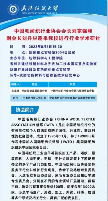 9月3日,中国毛纺织行业协会会长刘家强、副会长刘丹到我校访问交流,参观学校纺织科技馆,中国毛纺织行业协会会长刘家强、副会长刘丹分别就毛纺行业发展趋势分析、中国毛纺织行业协会科技工作汇报进行了交流报告。