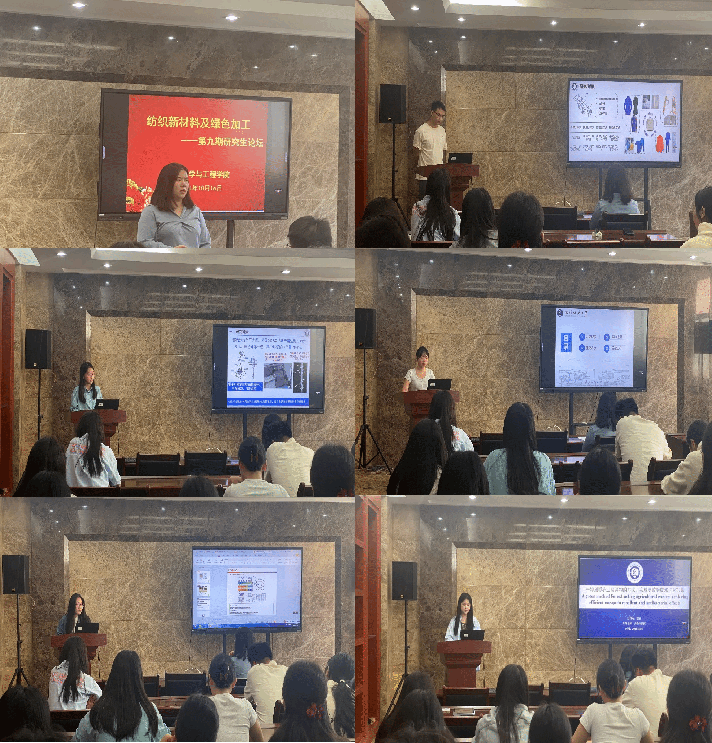 论坛上,任晋阳、贺楠、陈运娜、陈淑婷和秦缘五位同学依次介绍了自己的研究课题和目前取得的研究进展,并分享了自己的科研经验。主讲同学的研究课题包括同轴共捻超结构复合纱、提取农业废弃物、耐高温芳纶气凝胶纤维、甘油-水体系下聚酰亚胺织物载体、嵌入纺涤棉复合纱线,契合了“纺织新材料及绿色加工”主题,代表了学院最新研究进展,参会人员积极提出问题和建议,营造了良好的学术氛围。