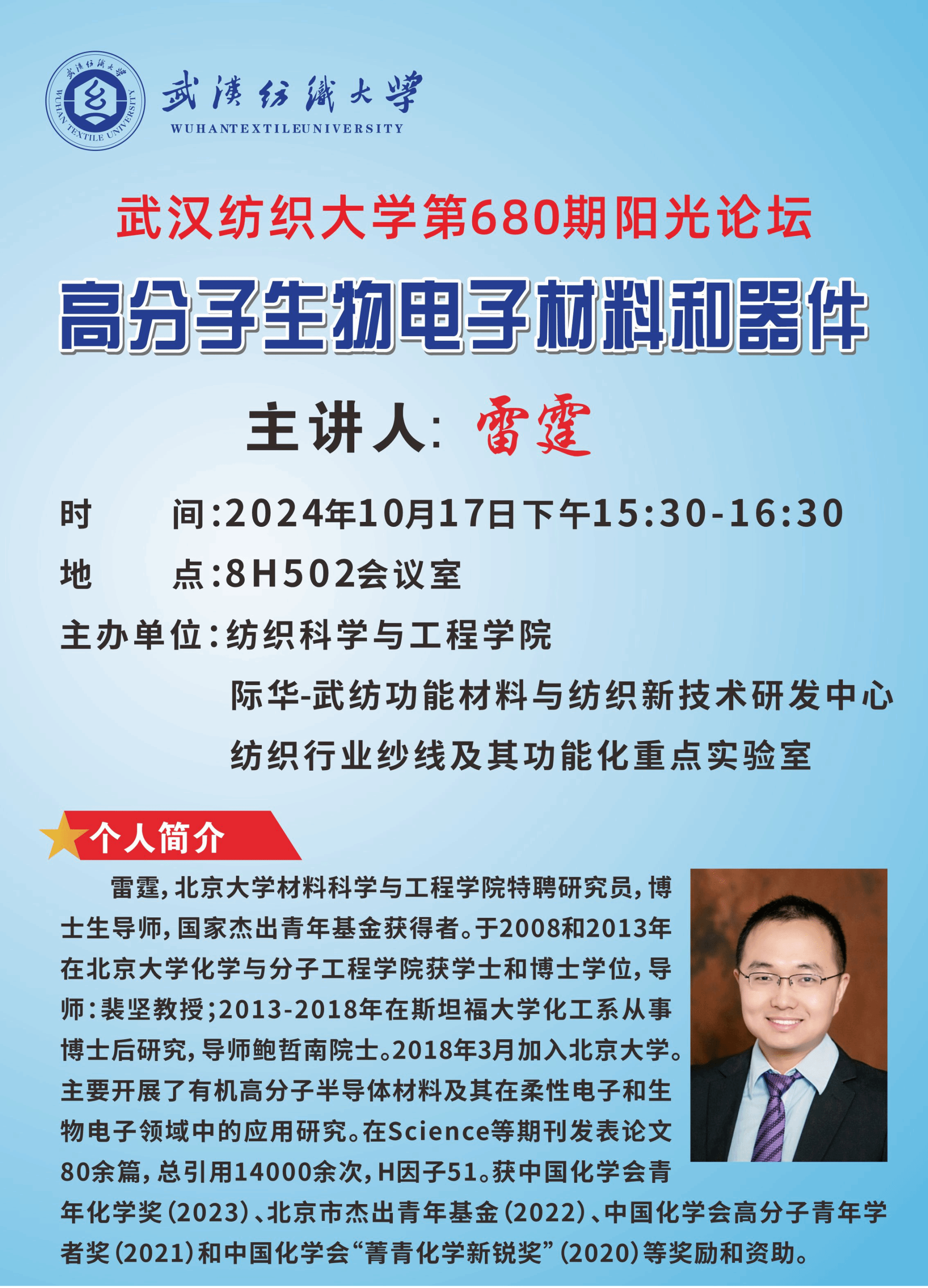 北京大学材料科学与工程学院特聘研究员、国家杰出青年基金获得者雷霆应邀于2024年10月17日下午做客我院,为我院师生作线下学术报告,学术报告题目为:“高分子生物电子材料和器件”。学术报告由副院长夏治刚教授主持,夏治刚教授和学院部分教师在学院8H502会议室进行现场聆听报告和交流发言,广大师生聆听了本次学术报告。