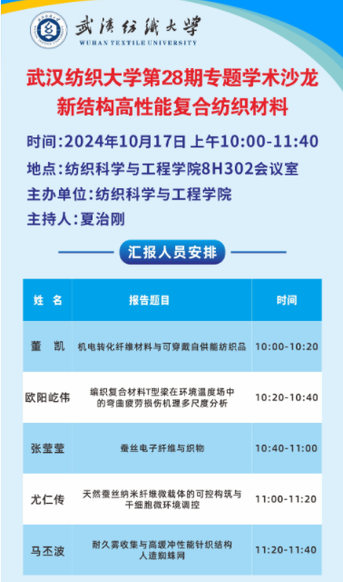 本次学术沙龙活动中,董凯、欧阳屹伟、张莹莹、尤仁传、马丕波共5位老师依次作为主讲人分别以“机电转化纤维材料与可穿戴自供能纺织品”、“编织复合材料T型梁在环境温度场中的弯曲疲劳损伤机理多尺度分析”、“蚕丝电子纤维与织物”、“天然蚕丝纳米纤维微载体的可控构筑与干细胞微环境调控”、“耐久雾收集与高缓冲性能针织结构人造蜘蛛网”为题作了报告,主讲内容涵盖了可穿戴自供能纺织品、编织复合材料T型梁、蚕丝电子纤维与织物、蚕丝纳米纤维、人造蜘蛛网等领域,契合了“新结构高性能复合纺织材料”主题,并和在场师生围绕报告技术方案、关键科学问题、创新性研究方向、基金项目申请、技术与项目合作、成果转化等方面展开了深入的探讨,现场气氛热烈。