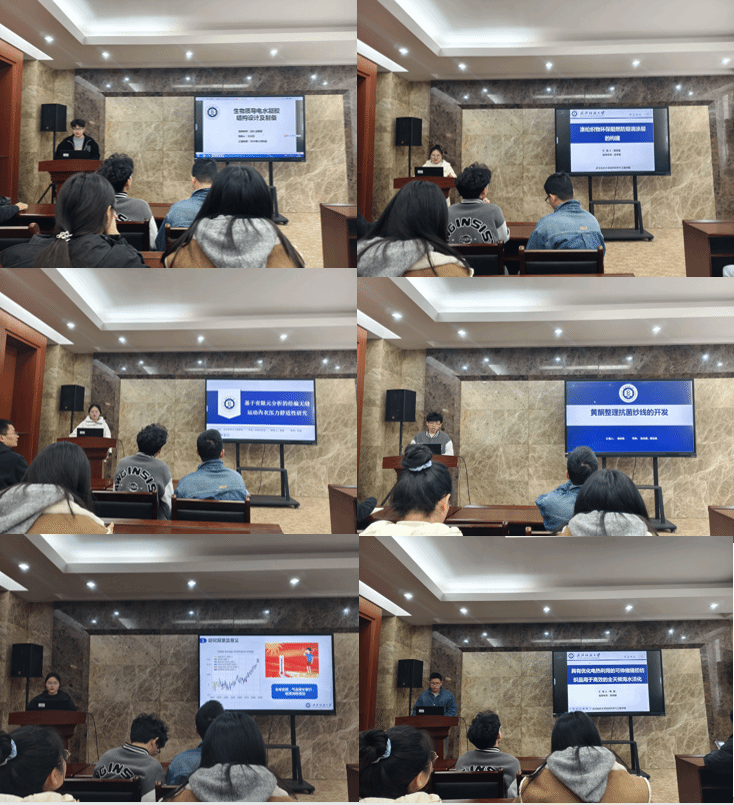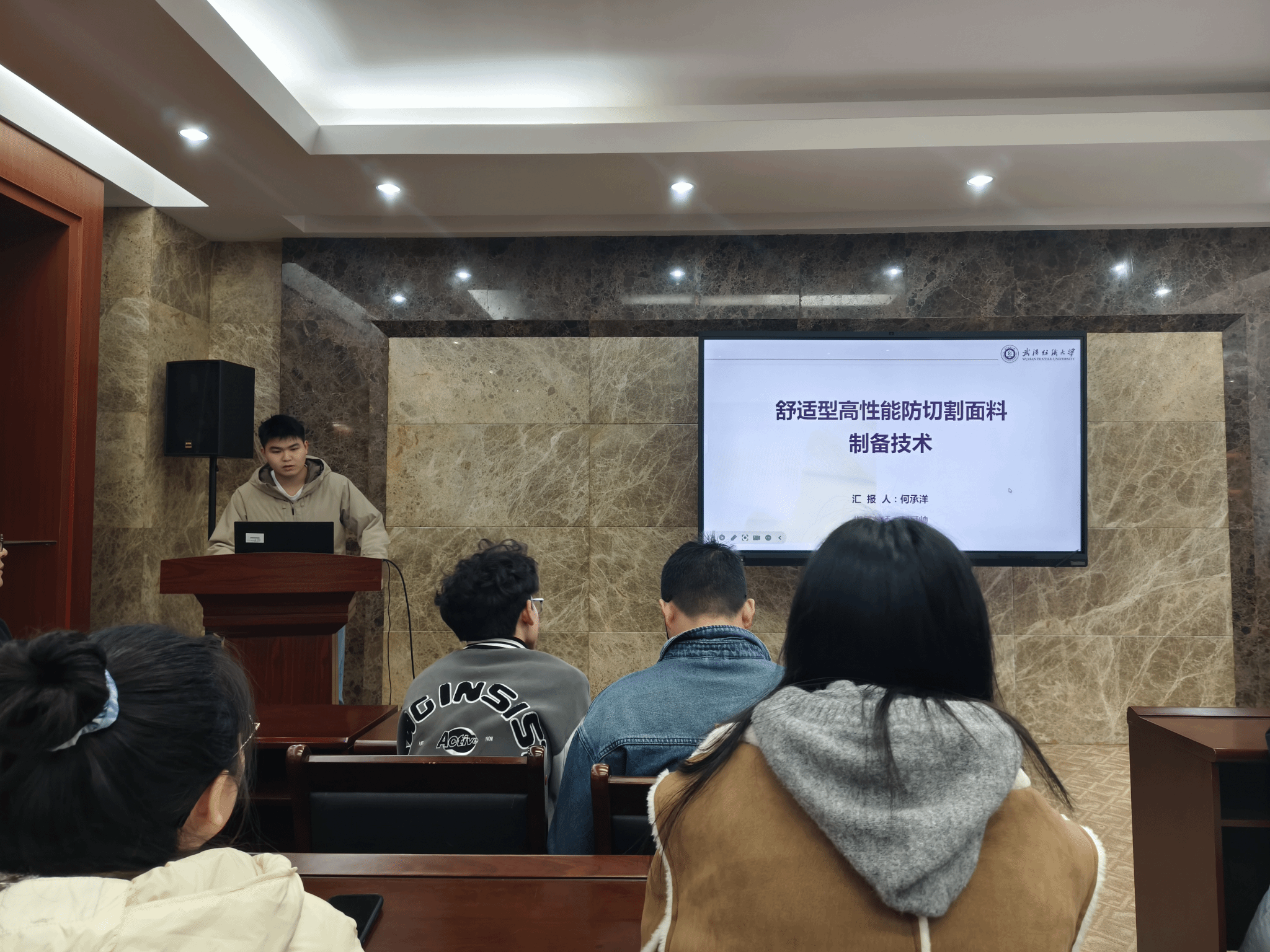 论坛上,王蒙召、赖嘉馨、高雅、侯林松、刘 洁、陈 斌、何承洋七位同学依次介绍了自己的研究课题和目前取得的研究进展,并分享了自己的科研经验。主讲同学研究课题包括,生物质导电水凝胶结构设计及制备、涤纶织物环保阻燃防熔滴涂层的构建、基于有限元模型的经编运动内衣压力舒适性研究、功能纺织品的制备及研究、纤维素基辐射制冷膜的制备及其性能研究、具有优化电热利用的可伸缩缝纫纺织品用于高效的全天候海水淡化、舒适型高性能防切割面料制备技术。契合了“纺织新材料及绿色加工”主题,代表了学院最新研究进展,参会人员积极提出问题和建议,营造了良好的学术氛围。