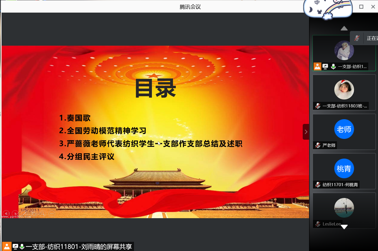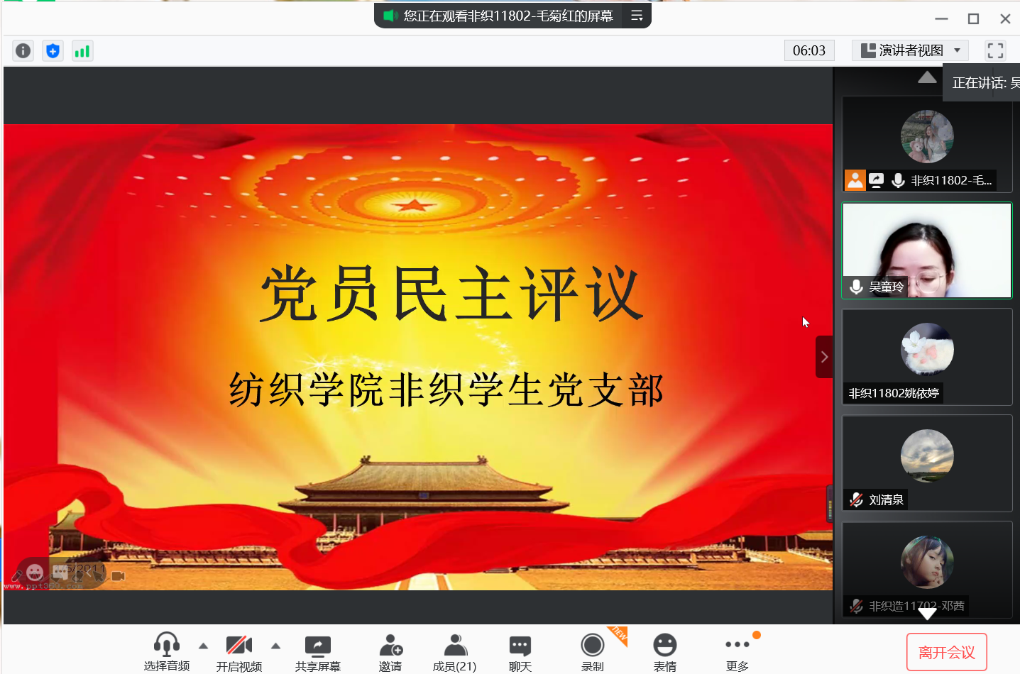 12月28日晚,非织学生支部通过线上+线下相结合的方式召开了度民主评议党员活动总结交流会,威廉希尔体育党委副书记陈海参会,吴童玲老师主持了会议。会上,吴老师分别从“思想、 学习、工作、生活、廉洁、服务”几方面作了述职汇报,既肯定了一年的工作,又提出了未来的发展方向。而后全体党员认真对本小组进行了坦诚、深刻的作批评与自我批评并进行了无记名测评。