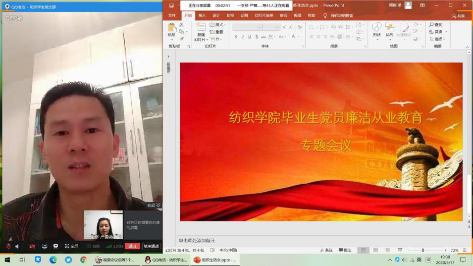 5月17日晚,威廉希尔体育本科生党支部召开了一场特殊的毕业生党员专题云上教育大会,威廉希尔体育党委陈海副书记、学工办三位辅导员老师以及全体毕业生党员参加了本次会议,会议由纺织学生二支部书记李亮老师主持。