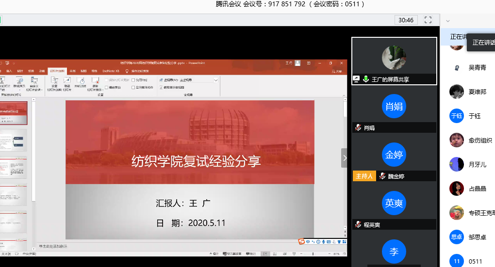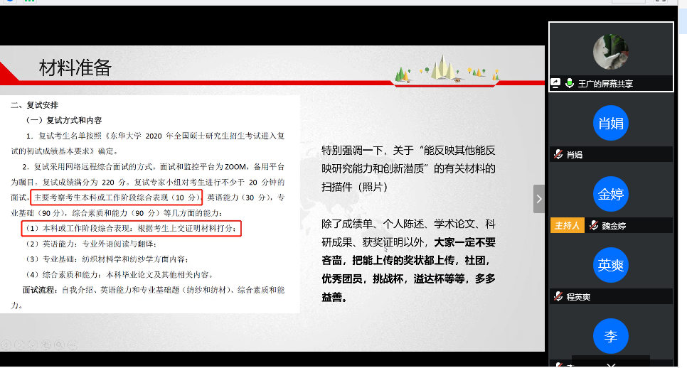 为助力2020届考研学子实现升学梦想,提高考研复试成功率,5月11日下午四点,威廉希尔体育召开线上东华一对一考研复试指导会。东华大学学工处、就业处袁海源老师,毕业年级辅导员魏金婷老师,威廉希尔体育辅导员肖娟老师,东华研究生学姐王广、范天琪为考生进行了专题复试指导,各位考研学子积极参加了本次会议。