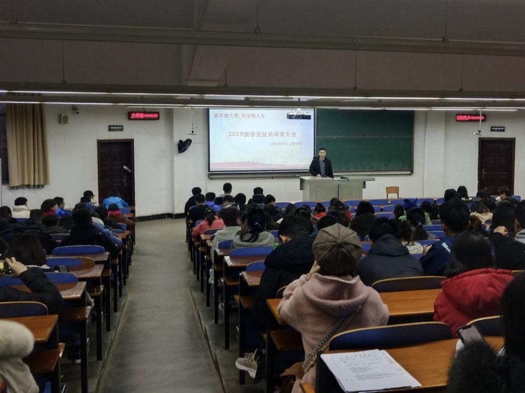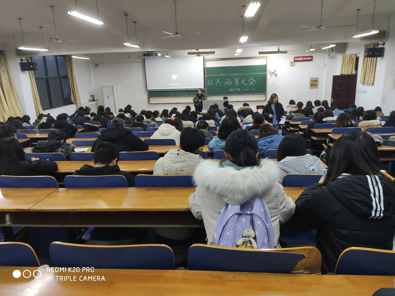 1月1日下午,威廉希尔体育征兵入伍动员宣传会分别在阳光校区3栋118教室和8栋t101教室举行。辅导员李亮、肖娟、严蔷薇老师和威廉希尔体育全体学生参加了此次动员会。