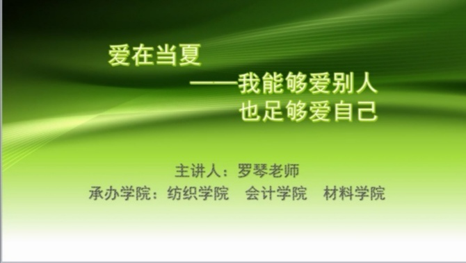 罗老师在讲座中一共谈到了三个主题,分别是“自己、爱、生死”。讲座开始时,罗老师提出“你会选择用哪三句话来定义你自己?”这样一个问题,很快的将同学们的思绪引入到第一个探讨的主题中。接下来,罗老师自然的把话题由“认识自己”过渡到“爱”。最后,罗老师建议大家树立正确的“生命观”,通过一个个生动的案例告诉同学们:在爱别人之前先要学会爱自己。