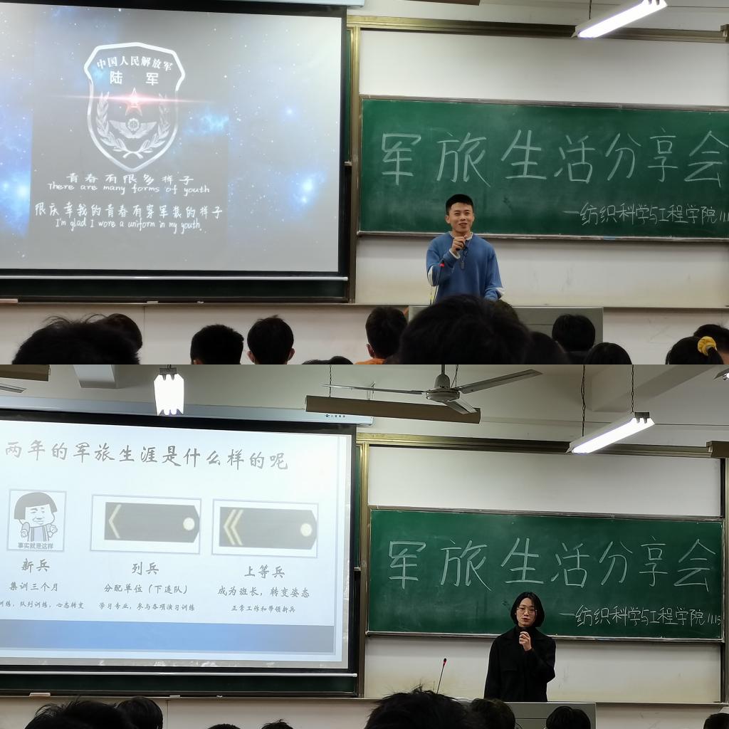 11月15日晚上6点,威廉希尔体育在3栋教学楼03-115教室举行军旅生活报告会。本次报告会邀请了威廉希尔体育纺织12001班张汶和纺织52003班游子吟为同学们分享他们的军旅生活。报告会由纺织实践部田浩然主持、辅导员严蔷薇、李亮、吴童玲及全体新生参加活动。