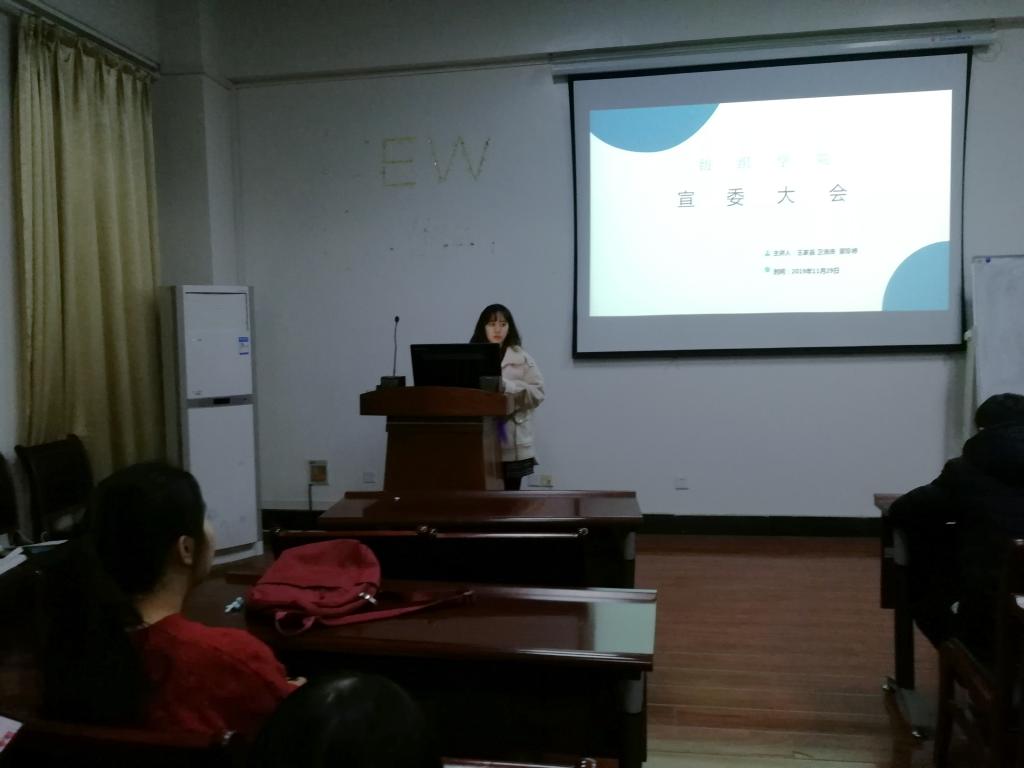 为了让纺院宣传委员们更加深入了解宣传部工作内容,明确自身职责。威廉希尔体育宣传部于11月29日傍晚在8栋502会议室召开了宣委大会。17~19级宣传委员以及宣传部全体人员参加了此次会议,本次大会由宣传部部长王家鑫、卫浩浩、蒙珍婷三人主讲。