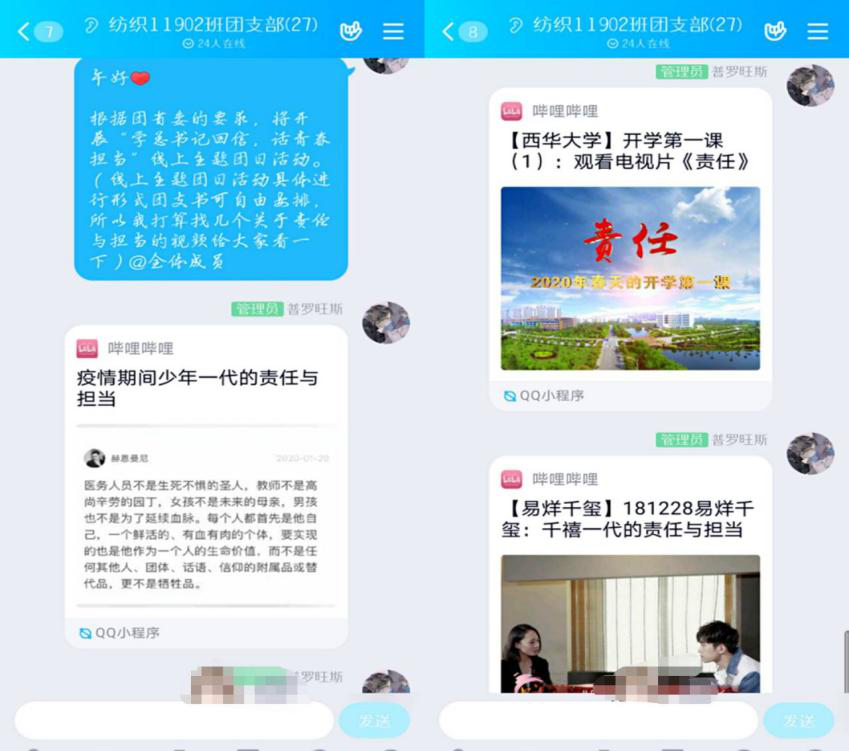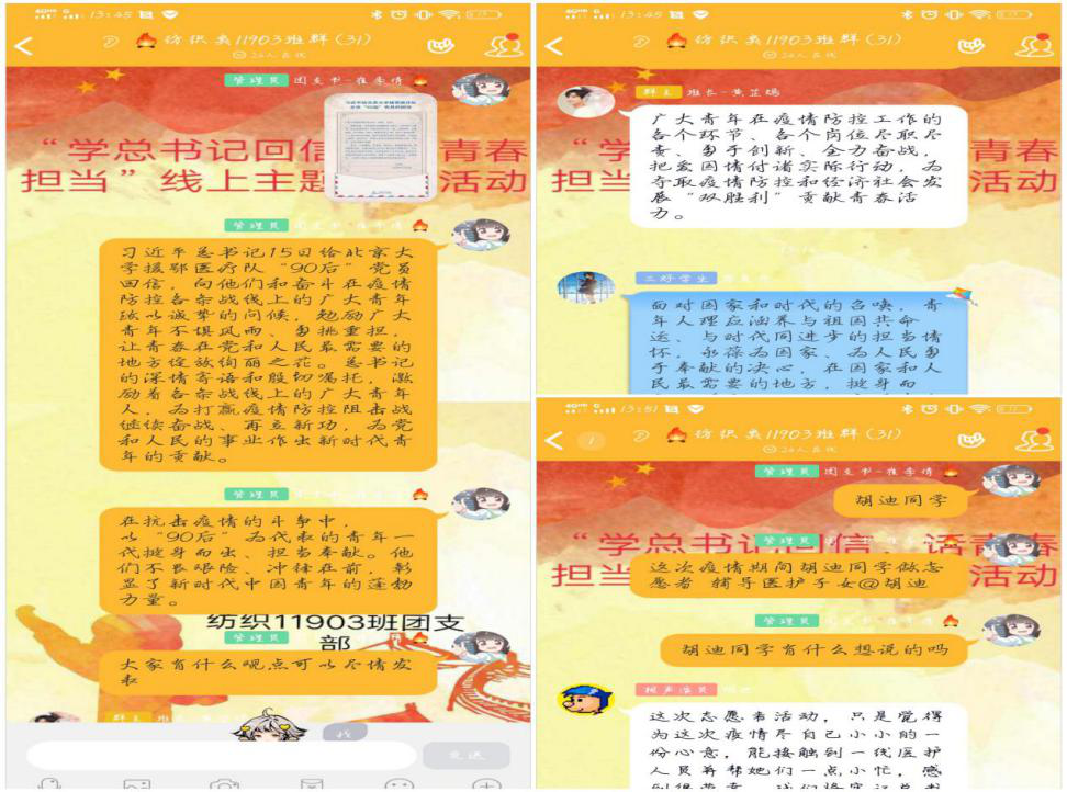 纺织11903班团支部在团支部群中开展线上主题团日活动。11903班胡迪同学作为志愿者辅导医护人员子女,分享了自己的感想:这次志愿者活动,只是觉得为这次疫情尽自己小小的一份心意,能接触到一线医护人员并帮她们一点小忙,感到很荣幸。我们将牢记习近平总书记对广大青年的要求,肩负时代赋予我们的使命,用实际行动唱响新时代青春之歌。大家纷纷为胡迪同学点赞,并表示会以其作为榜样,用自己的微薄之力,奉献社会,彰显价值。