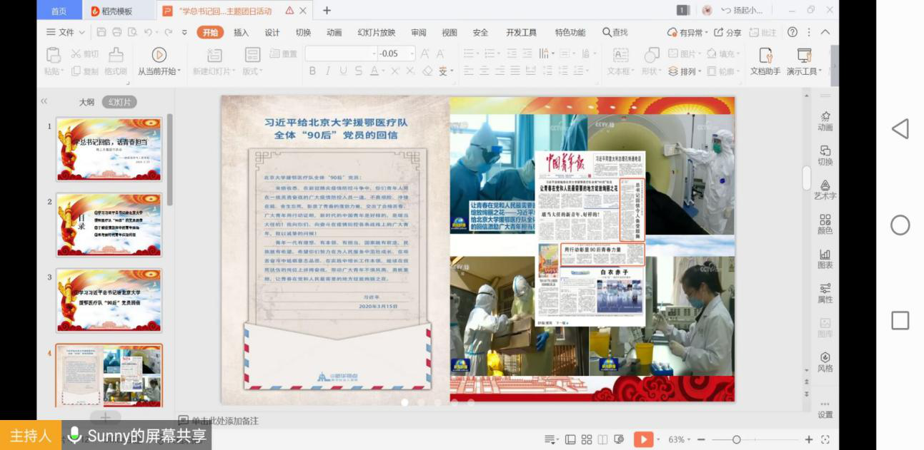 会议伊始,主持人重温了习近平总书记给北京大学援鄂医疗队的回信,引导大家深入思考,指出这不仅是给援鄂医疗队党员的一封信,也是给广大青年的一封信。在信中,习近平总书记赞扬了在疫情一线奋战的青年党员,表达了国家对他们的期望,同时也为广大青年指明成长道路。