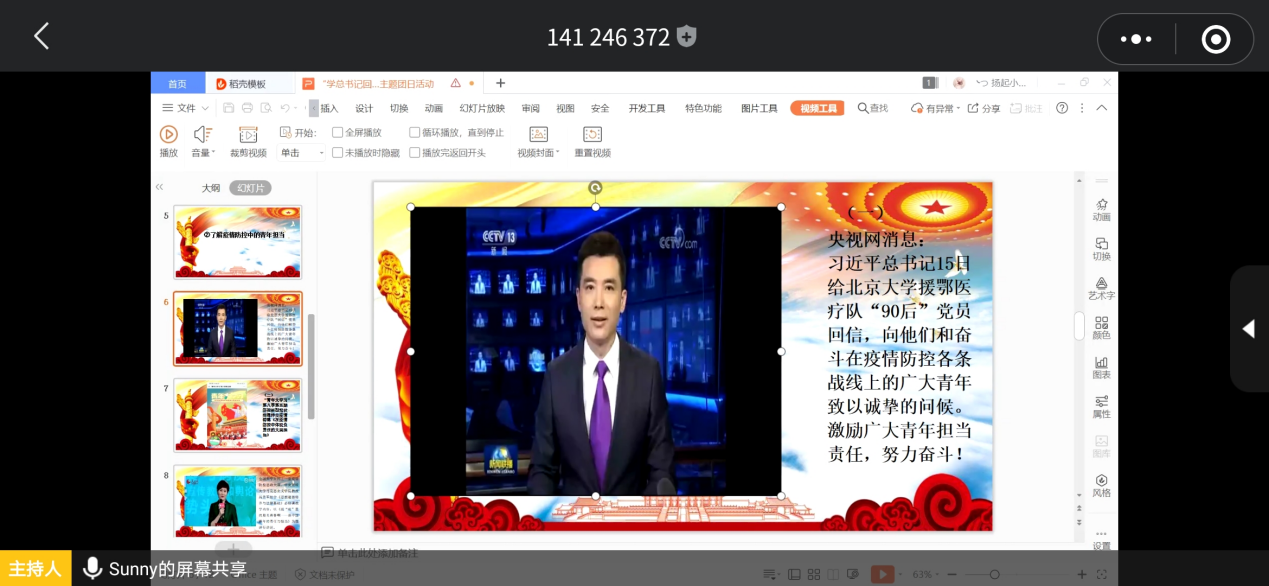 随后大家一起学习了央视新闻和“同上一节思政课”的相关视频,探讨广大青年的担当与责任。视频中有许多青年战“疫”的例子,我们从中感受到青年们的爱国情操及他们对责任的传承,最终明确青年担当,新时代青年应“胸有大志、心有大我、肩有大任、行有大德”。