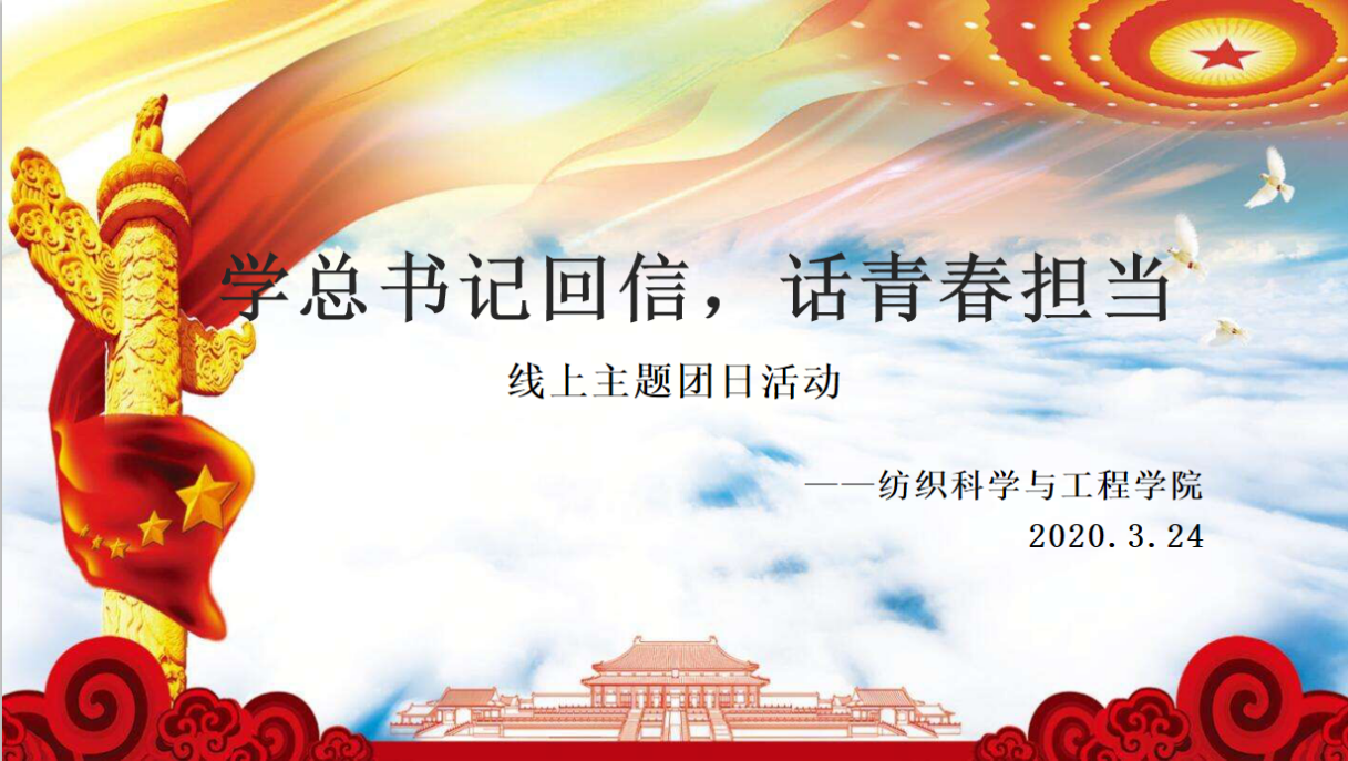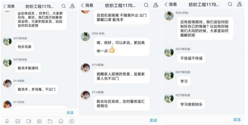 其中纺织工程11701班全体27名学生开展线上主题团日活动。活动中,团支书组织大家认真阅读了习近平总书记的回信,并且分享了抗疫期间的体现各行各业勇于担当、乐于奉献的暖心视频。在本次团日活动中,同学们上下一心,关注疫情信息,深入了解相关内容,带头做好自身防控,以正确乐观的心态面对疫情。