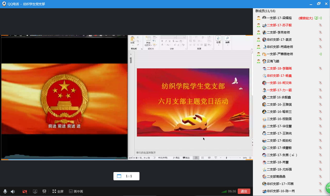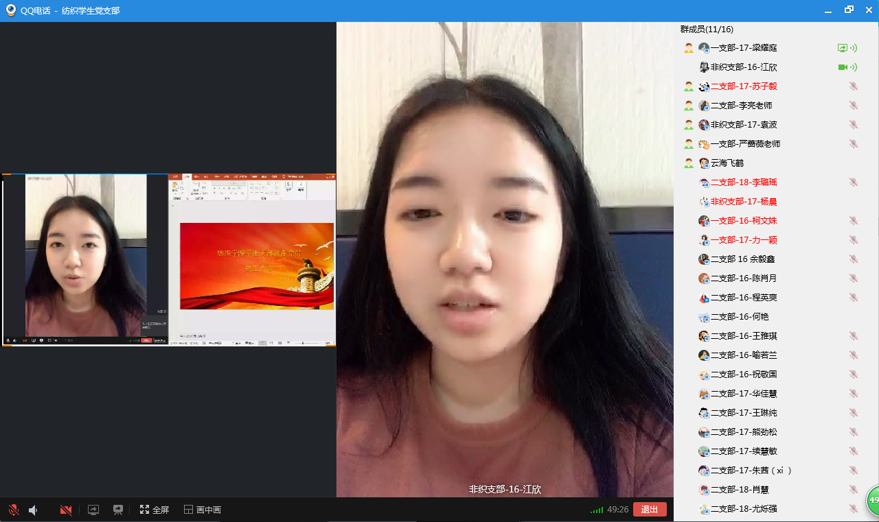 6月9日上午10点,威廉希尔体育学生党支部组织开展了六月份线上主题党日活动,本次活动在学生党支部QQ群中以群连线视频的方式开展,威廉希尔体育党委陈海副书记、三位本科生支部书记以及全体学生党员参与了本次云上会议,会议由纺织学生一支部书记严蔷薇老师主持。
