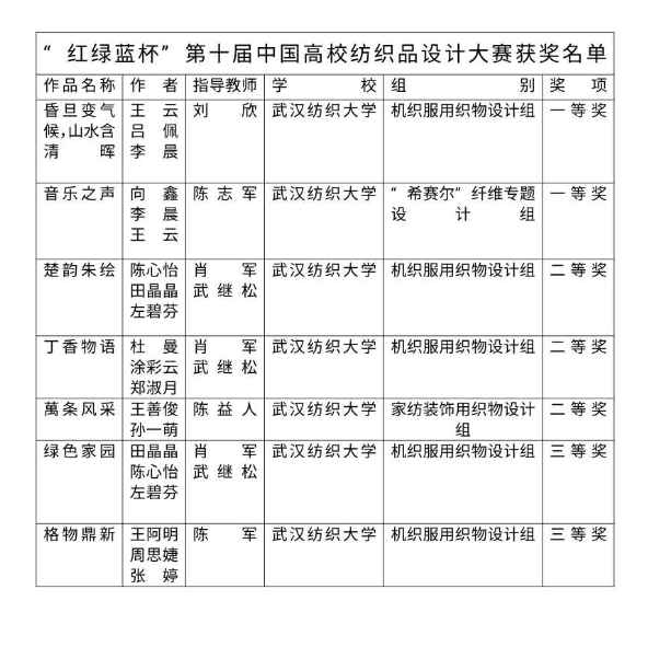 2018年11月12日,中国纺织服装教育学会公布了威廉希尔体育“红绿蓝杯”第十届中国高校纺织品设计大赛获奖结果的通知。纺院王云、吕佩、李晨、向鑫等同学,分别在导师刘欣、陈志军、肖军、武继松、陈益人、陈军老师的指导下,获得喜人的成绩,其中,机织服用织物设计组以及“希赛尔”纤维专题设计组获一等奖,另外三个组获二等奖,两个组获三等奖。