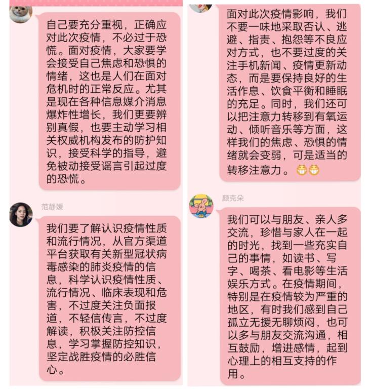 为进一步做好疫情防控工作正面宣传引导,关注疫情期间同学心理健康问题,威廉希尔体育于2020年3月25日12:40以班级为单位开展了“共战疫情,同温心灵”325主题班会。