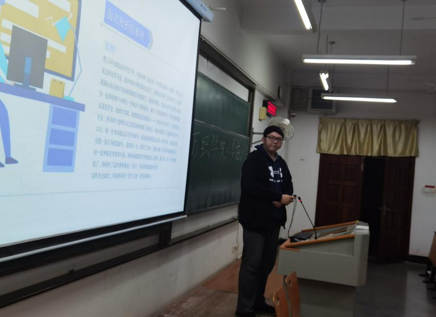 胡靖贤首先为大家讲解了挫折的含义,并用具体事例详细讲述了面对挫折应该采取的正确态度,提出每一名同学都应该积极克服,勇敢地面对挫折:一要正确认识挫折;二要冷静且客观地分析挫折产生的原因;三要积极寻求战胜挫折的方法。