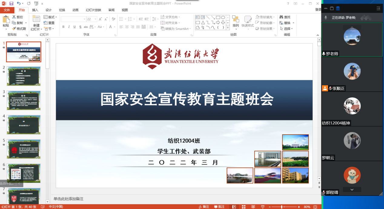 为了进一步教育引导广大学生牢固树立国家安全意识,自觉维护国家安全,3月6日晚,我院各年级依托QQ群、腾讯会议等网络平台,陆续开展了“国家安全教育”线上特别主题班会活动,学院党委副书记、全体辅导员、班主任参加。