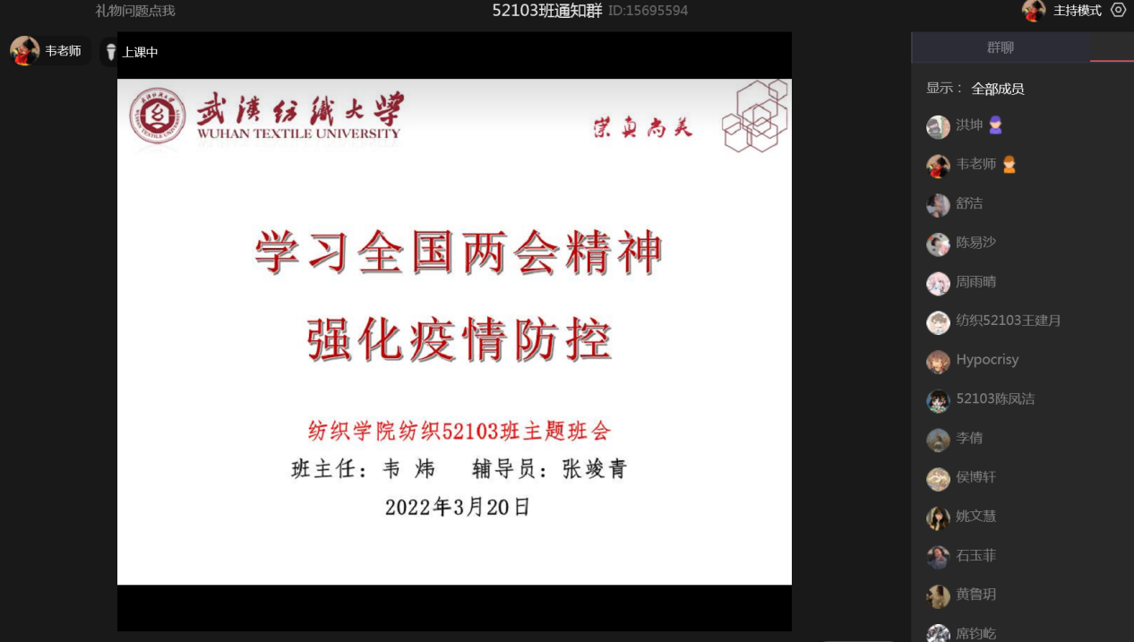 为了深入贯彻落实全国两会精神,引导学生深刻领会、准确把握两会精神实质,切实增强青年学子的责任感和历史使命感。3月20日,威廉希尔体育各班级召开了学习2022年全国两会精神主题班会,各年级辅导员、各班班主任全程参会。