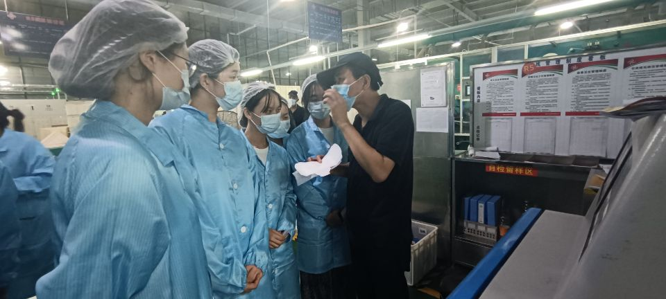 在李厂长的细心讲解下,纺编青春实践团深入了解了一个产品的生产过程。首先将绒毛浆和高分子融合,通过转孔包覆起来,形成棉芯,接着采用丝宝集团的创新工艺——主要是通过橡皮筋缠结,达到防侧漏的目的,再将棉芯压实,把产品复合起来,并在表面层形成导流条花纹,到这里主要流程已经完成大半,再只需切出护翼形状并将其折叠、贴离型纸,最后通过变横工艺粘贴包膜纸,这样一片卫生巾就生产完毕了。“长见识了,一片看似简单的卫生巾背后却是大科学!”实践团成员黄锐易兴奋的说。