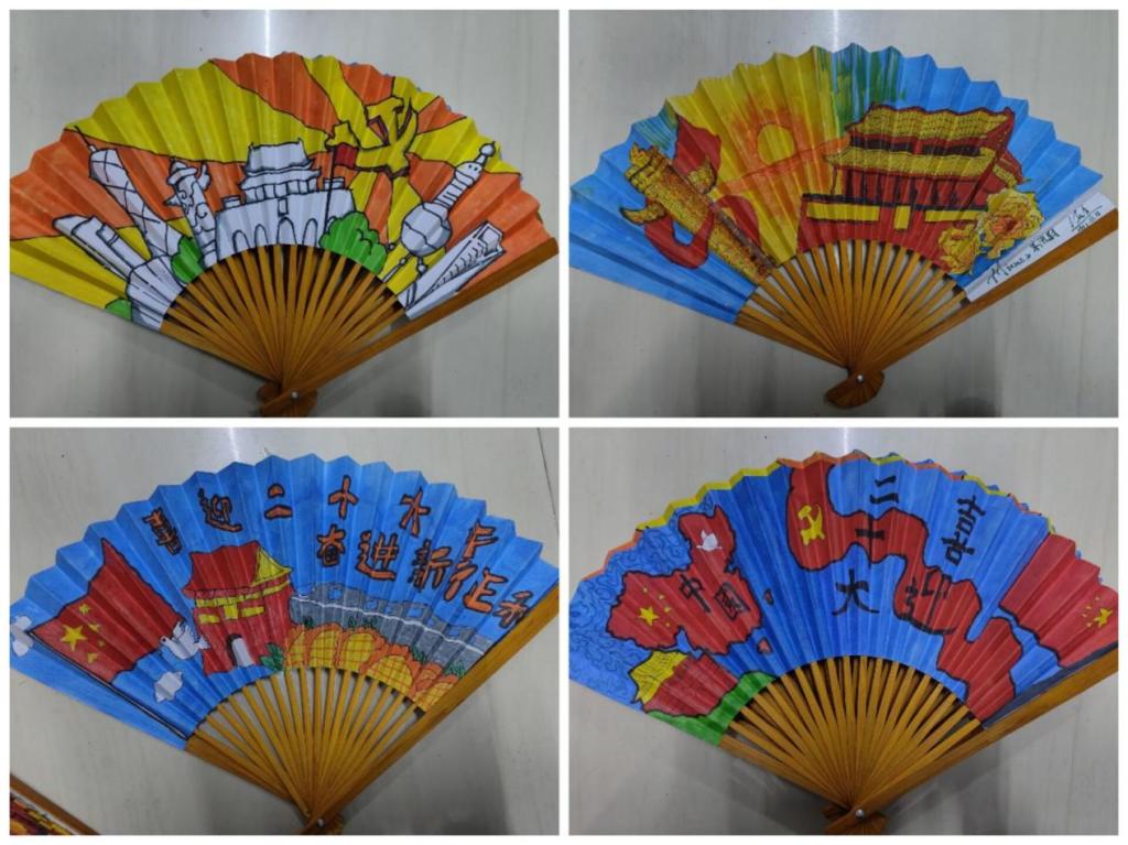 活动伊始,学院给同学们分发空白扇子以及绘图工具,同学们拿到工具后,教室里充满了激烈的讨论声,大家共同讨论扇面的布局以及配色。在讨论后,同学们兴趣盎然,纷纷拿起毛笔,在折扇上挥毫泼墨,仔细描摹,起笔,落笔,或浓墨重彩,或轻描淡写,一笔一画间包含同学们对中国传统文化的热爱,对党的深情祝福。经过同学们用心绘制下,一幅幅充满诗意雅趣、唯美精致、古色古香的扇面就制作完成了。随后老师们也共同讨论学生作品,同学们热情地展示自己的作品并交流自己制作时的心得与体会。活动最后,老师们与同学们共同合影留念,记录这精彩的活动。