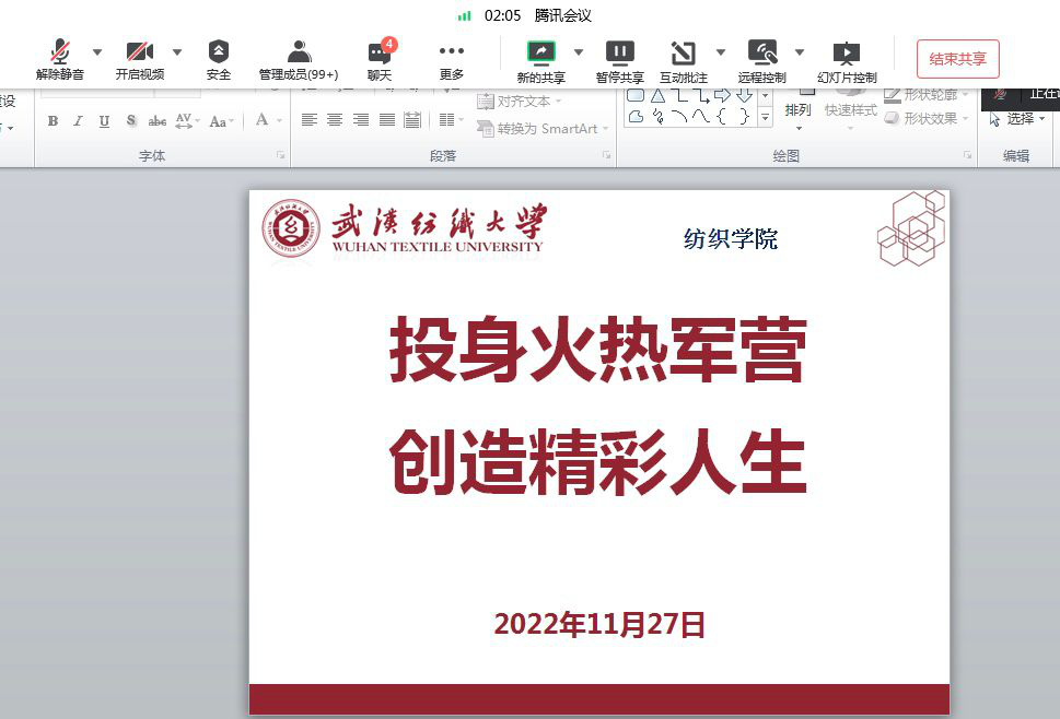 11月27日,威廉希尔体育线上开展“投身火热军营,创造精彩人生”的主题班会,班会由19级辅导员李巧中老师主持,李老师先给同学们播放了《火热军营 精彩人生》的征兵宣传片,让同学们感受到祖国国防和军队现代化建设成就,以及新时代军人保家卫国的使命担当。同学们在观看宣传片之后表示感慨万分。纺织11903班李飞表示,青春不止眼前的潇洒,还有家国和边关。“国有难, 邦有危,我辈学子自当投笔从戎",这是战争年代学生们对青春的选择;“把热血挥洒在实现强军梦的伟大实践”,这是和平时期青年对历史的担当。