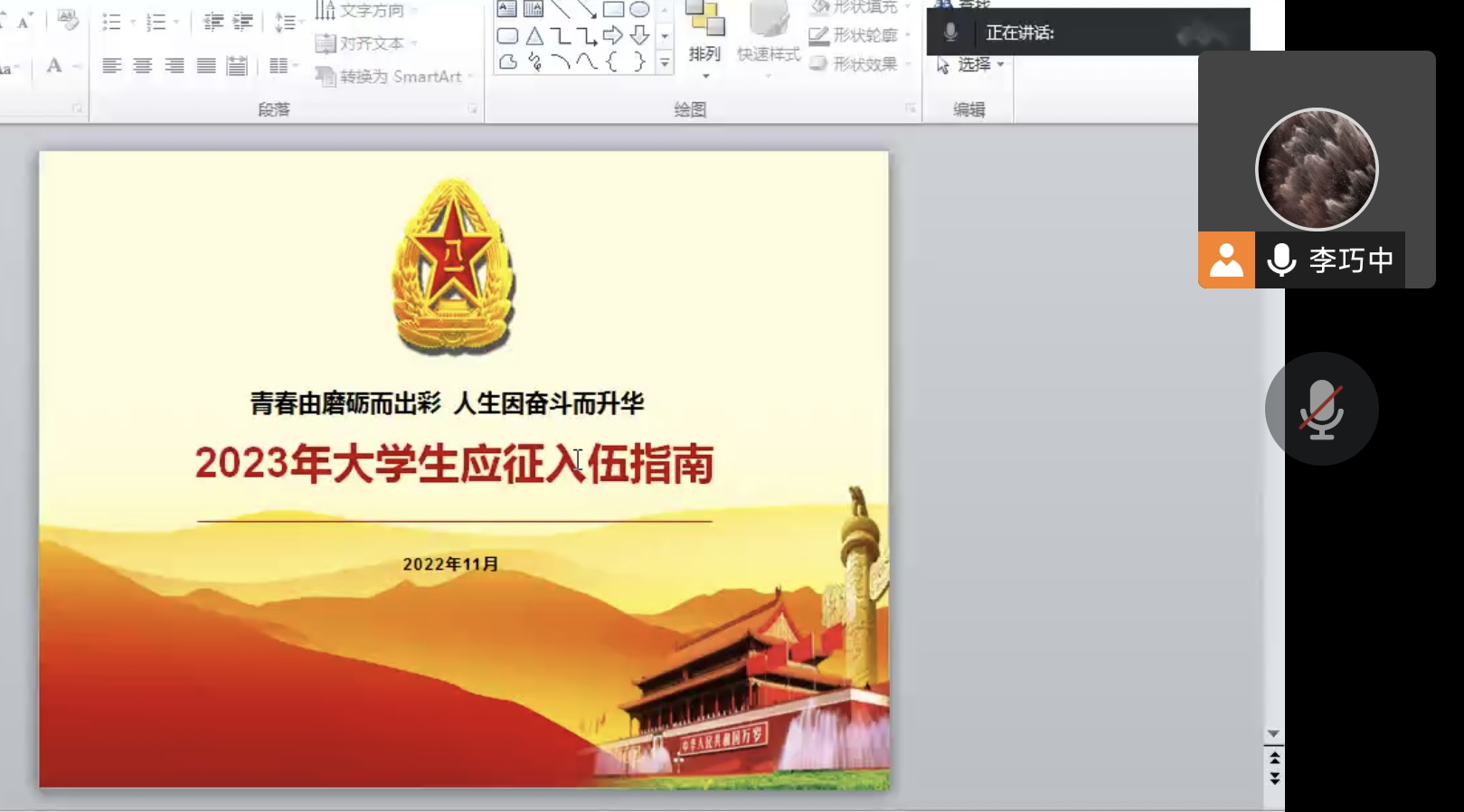 11月23日,威廉希尔体育各年级分别在线上开展入伍征兵宣讲,19级辅导员开展全体学生的入伍征兵宣讲,为同学们进行2023春季征兵的政策讲解,李巧中老师强调国无防不立,民无兵不安。大学生征兵工作是治国安邦的大事,是加强国防和军队建设的迫切需求,广大学生要积极响应国家的号召积极入伍。20级辅导员吴童玲从征兵入伍的十大优势及收获、退役士兵的优惠政策、征兵入伍的条件及要求、征兵入伍基本流程四个方面为大家开展政策宣讲。21级辅导员张竣青鼓励同学们抓住机遇,积极响应国家号召,投身军营报效祖国。22级辅导员王然鼓励同学们在军营中历练、为我国建设现代化人民强军中奉献青春热血。