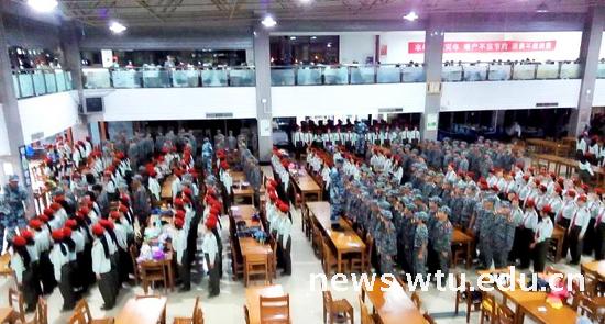由于接连几天都下着雨,而军训就为期短短的那么几天,时间过了,军训也就过了。为了让新生更加深刻的明白军训对于大学的意义,学校实行了在下雨时的“食堂军训”。一食堂一楼满满的都是穿军装的“战士们”,即使外面下着雨,但里面还是一如既往的操练。站军姿,走正步,高抬腿等一系列的军训动作丝毫没有减少,反倒更加增强了这军训的气势。即使天公不作美,我们还是有我们的高端大气助成长的“食堂军训”。